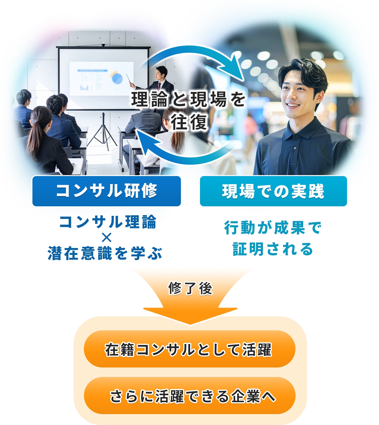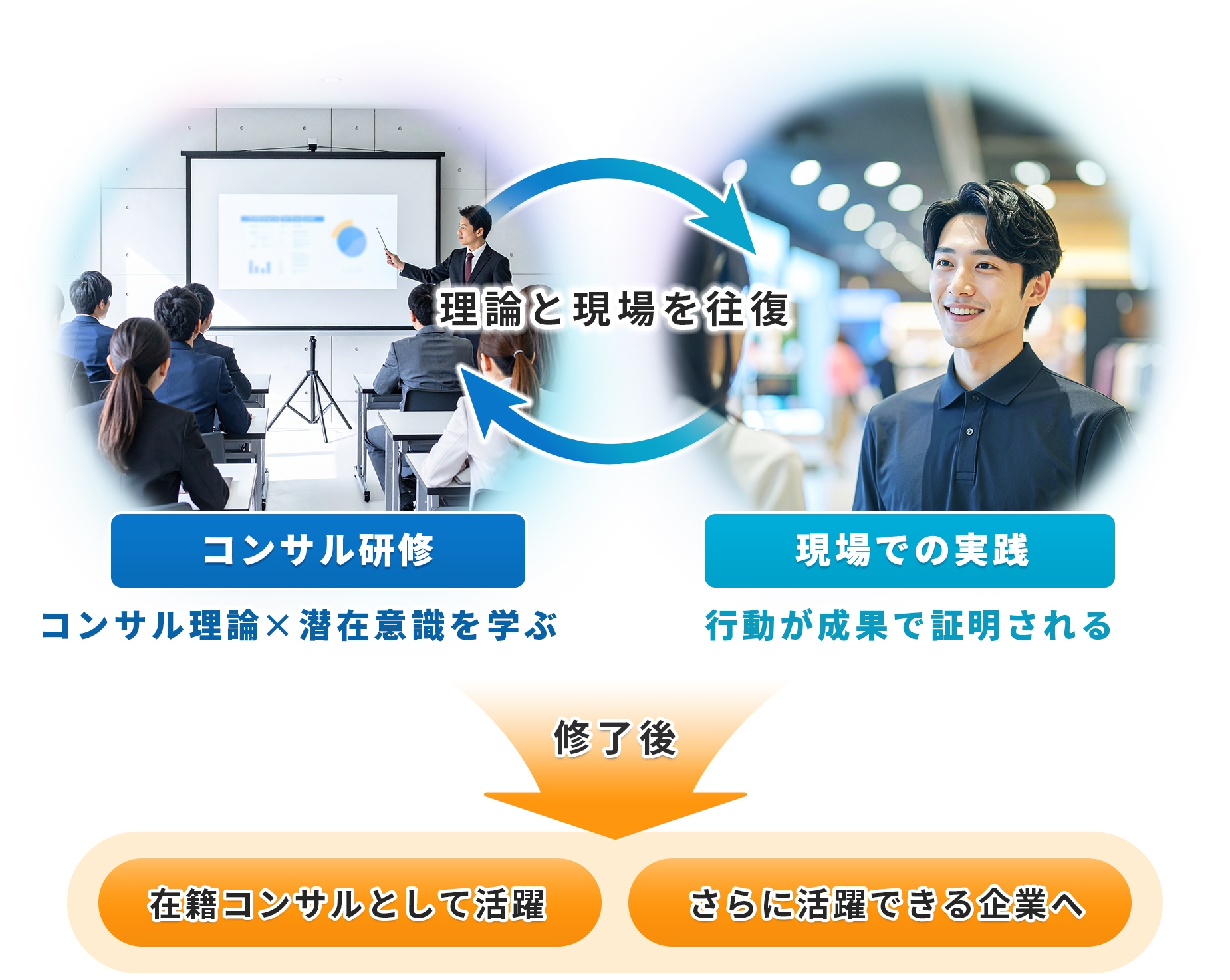 コンサル留学では「コンサル理論x潜在意識」を研修で学び、現場で実践を積み重ねることで、真のコンサルタントに必要な要素を身につけることができます。